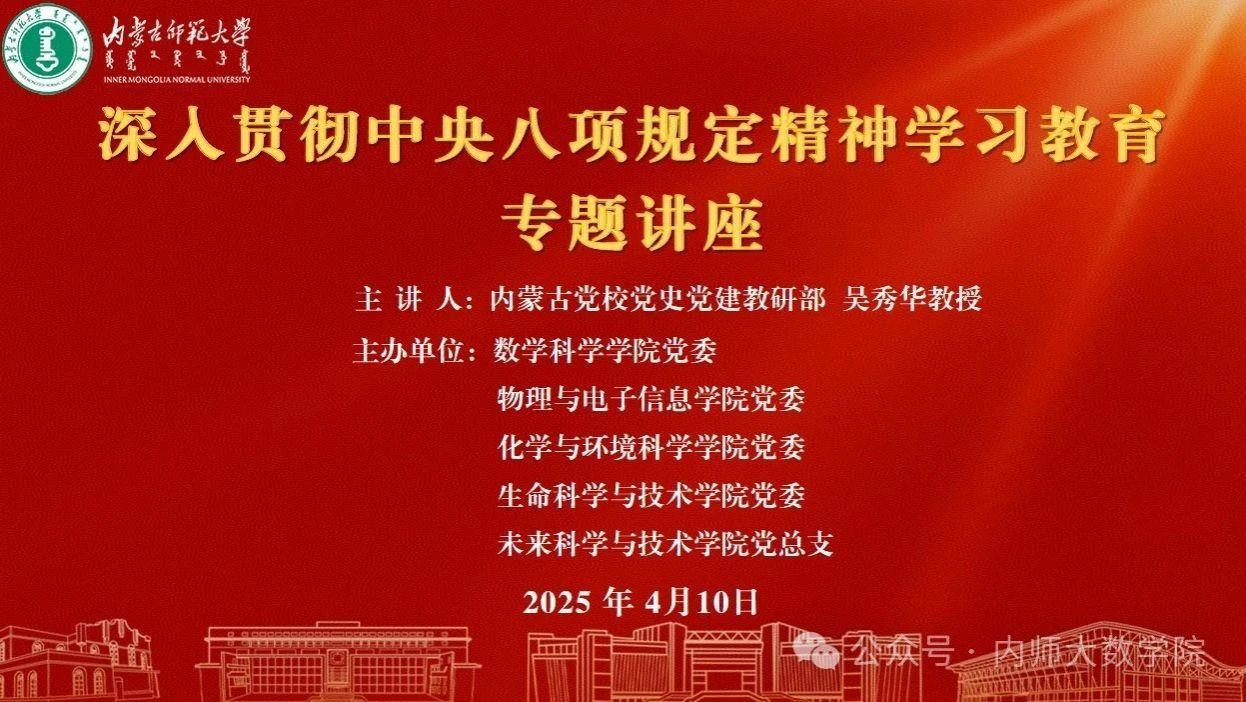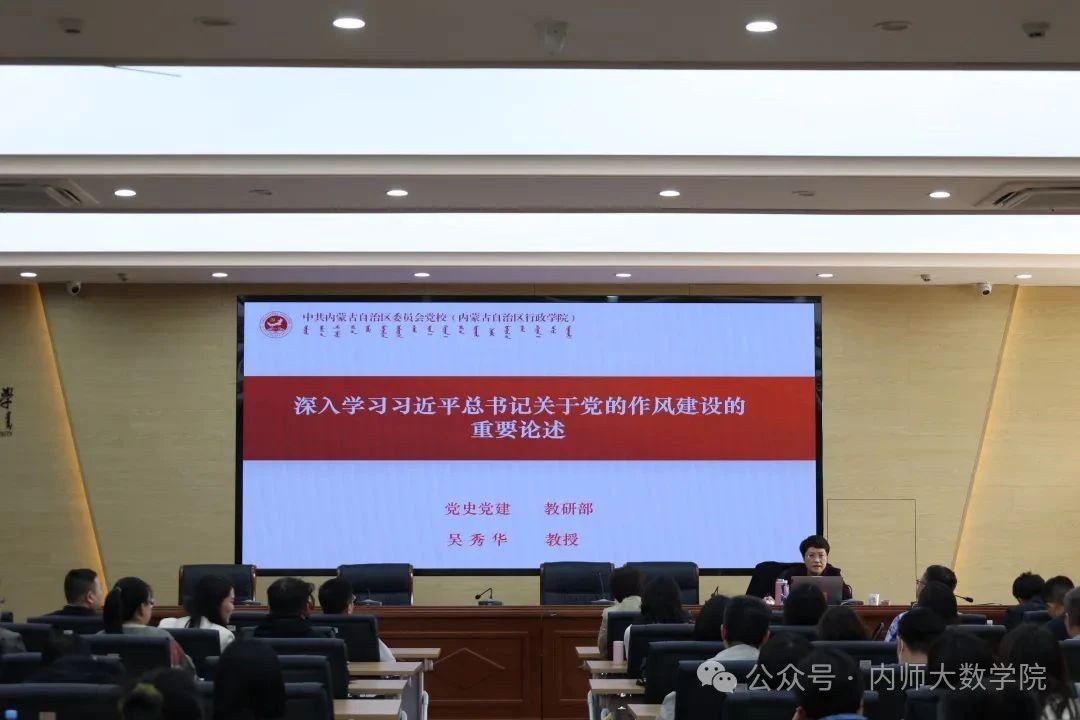 为深入贯彻落实党中央、自治区党委、学校党委深入贯彻中央八项规定精神学习教育精神和要求,高质量开展学习教育活动,4月10日,威廉希尔官网联合化学与环境科学学院、物理与电子信息学院、生命科学与技术学院和未来科学与技术学院在赛罕校区行政楼三楼报告厅举办深入贯彻中央八项规定精神学习教育读书班专题讲座。讲座邀请内蒙古党校党史党建教研部吴秀华教授作题为“深入学习习近平总书记关于党的作风建设的重要论述”专题讲座。