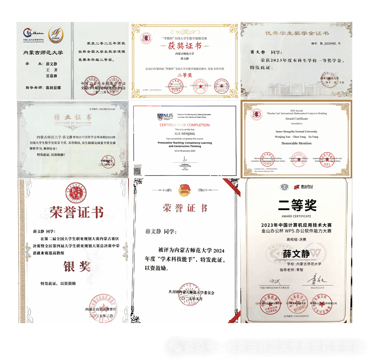 薛文静同学在校期间品学兼优,以交换生身份在北京“双一流”院校首都师范大学交流学习一年,并入选“卓越师范生拔尖培养计划”,以国家公派短期留学生身份到新加坡国立大学(NUS)学习。先后荣获2023年"高教社杯"全国大学生数学建模竞赛全国二等奖、2024年"华数杯"国际赛H奖(国际二等奖)、2024年全国大学生数学竞赛省级一等奖。她还利用课余时间积极参加校内外实践活动,担任大学生支教志愿者,与中小学生共同完成了“一起云课堂”等活动,赴和林格尔百什户学校支教,去首都师范大学附属回龙观育新学校进行教育实习。此外还先后担任英国威廉希尔唯一官网辩论社辩手,英国威廉希尔唯一官网学工助理等工作。