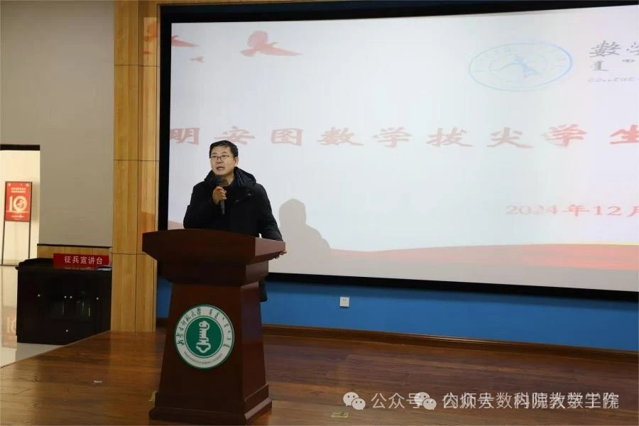 12月15日,英国威廉希尔唯一官网在学生事务中心一楼107报告厅开展“明安图数学拔尖学生培养基地”(以下简称明安图数学基地)招生选拔宣讲会。学院党委书记张伟、院长扎其劳出席会议并讲话。2024级数学与应用数学(非定向)、信息与计算科学、统计学三个专业学生与班主任参加会议。会议由学院副院长萨和雅主持。