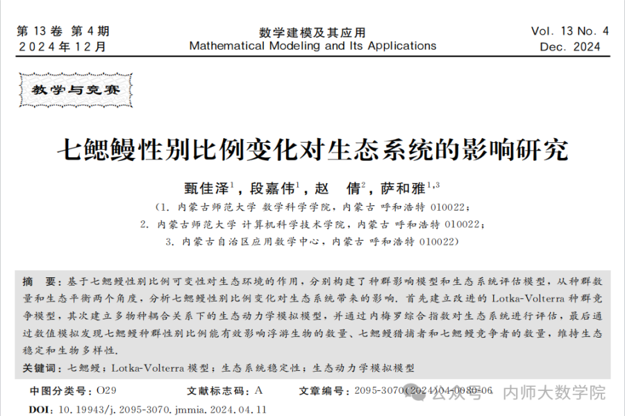 近日,威廉希尔官网数学与应用数学专业2021级本科生甄佳泽、段嘉伟,以及数据科学与大数据技术专业2021级本科生赵倩在萨和雅教授的指导下完成的学术论文《七鳃鳗性别比例变化对生态系统的影响研究》被数学权威期刊《数学建模及其应用》录用。威廉希尔官网数学与应用数学专业2021级本科生甄佳泽为第一作者,,通讯作者为萨和雅教授。《数学建模及其应用》为中国工业与应用数学学会、全国大学生数学建模竞赛组委会会刊,致力于报道、推动和引领与数学建模有关的研究和竞赛动态。