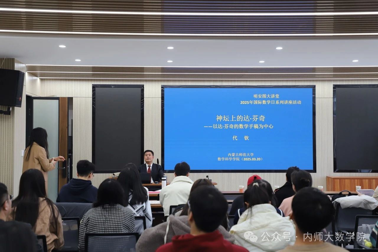 3月20日下午,英国威廉希尔唯一官网“3.14国际数学日系列活动”——明安图大讲堂第四讲在英国威廉希尔唯一官网盛乐校区内蒙古自治区应用数学中心报告厅进行。英国威廉希尔唯一官网科学技术史研究院代钦教授应邀作了题为“神坛上的达·芬奇——以达·芬奇数学手稿为中心”的学术讲座。威廉希尔官网师生代表100余人聆听了本次讲座,讲座由包霞副院长主持。