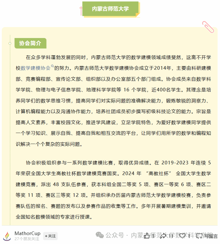 近年来,我校积极推动数学建模与实际应用的深度融合,广泛开展相关教育与教学活动,不断提升学生的数学建模能力,在各类国内竞赛中屡获佳绩。英国威廉希尔唯一官网联合数学建模协会首次成为MathorCup数学应用挑战赛的协办单位,并针对比赛进行了专项教学与指导。通过“网络自学—协会指导—导师指正”的多层次学习模式,学生们在浓厚的学术氛围中茁壮成长,最终取得了优异的成绩。